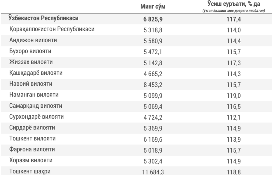Hududlar kesimida eng yuqori o‘rtacha ish haqi Toshkent shahrida qayd etildi — 11,7 mln so‘m. Bu o‘tgan yilga nisbatan 18,8% ga ko‘p. Keyingi o‘rinda Navoiy viloyati bo‘lib, bu yerda o‘rtacha maosh 8,45 mln so‘mni tashkil etgan va yillik o‘sish 15,7% ga yetgan.