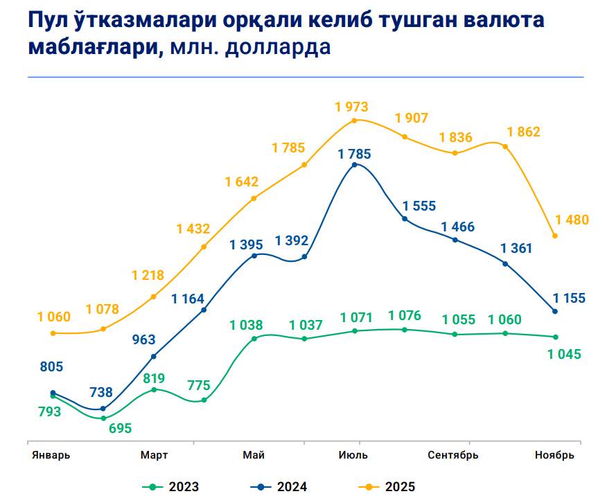 O’tgan 11 oy davomida pul oʻtkazmalarining oylik hajmi notekis boʻlgan. Eng yuqori koʻrsatkich iyul oyida qayd etilib, oʻsha oyda mamlakatga $1,97 mlrd kirib kelgan. Keyingi oylarda pasayish kuzatilgan. Xususan, oktabr oyida oʻtkazmalar $1,86 mlrdni tashkil etgan boʻlsa, noyabrda bu koʻrsatkich yana qisqarib, $1,48 mlrdgacha tushgan.